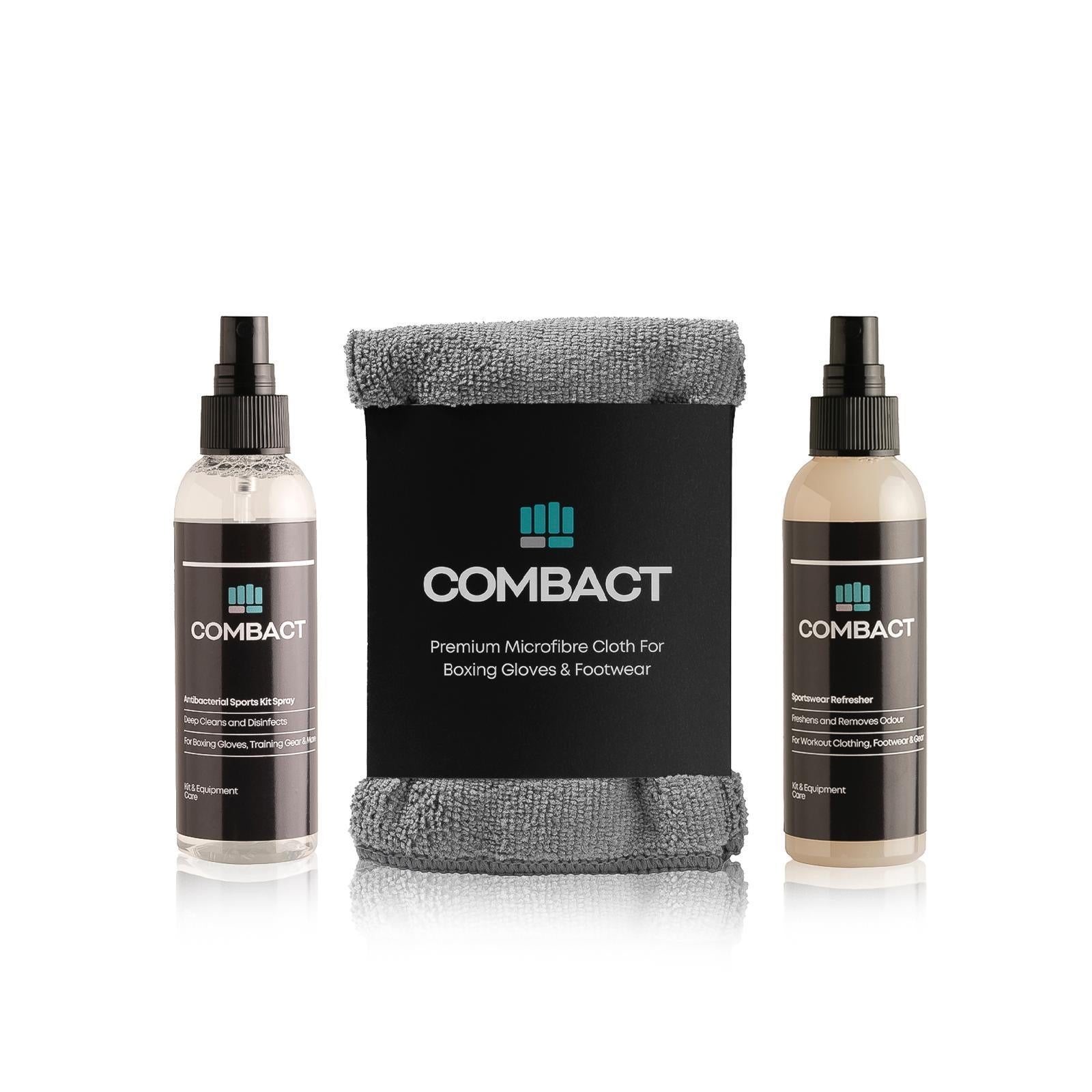 All-in-one gear cleaner and boxing glove deodoriser kit. Includes antibacterial spray that kills 99.9% of germs, an odour-neutralising spray with a fresh linen scent, and a fast-drying microfibre cloth. Designed for boxing gloves, pads, gym bags, and all workout gear. Quick-drying, no residue, and safe on leather and synthetic materials.